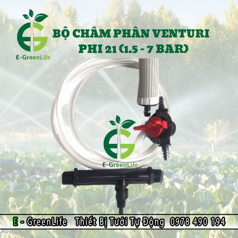 Bộ châm phân Venturi phi 21 model 1.5-7 bar có tác dụng đưa phân bón hoặc các dưỡng chất hòa tan trực tiếp vào dòng nước tưới, cung cấp dinh dưỡng đồng đều đến gốc cây, tự động, không cần điện năng.