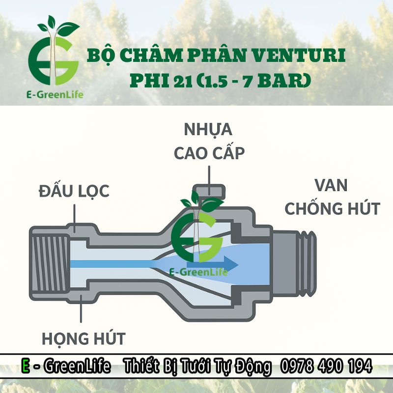 Nguyên lý hoạt động: Venturi phi 21 vận hành theo cơ chế hút chân không, dựa trên sự chênh lệch áp suất trong hệ thống tưới. Khi nước chảy qua Venturi, phân bón/dinh dưỡng được hút từ bồn chứa hòa vào dòng nước và phân phối trực tiếp đến cây trồng, đảm bảo hiệu quả cao và ổn định.