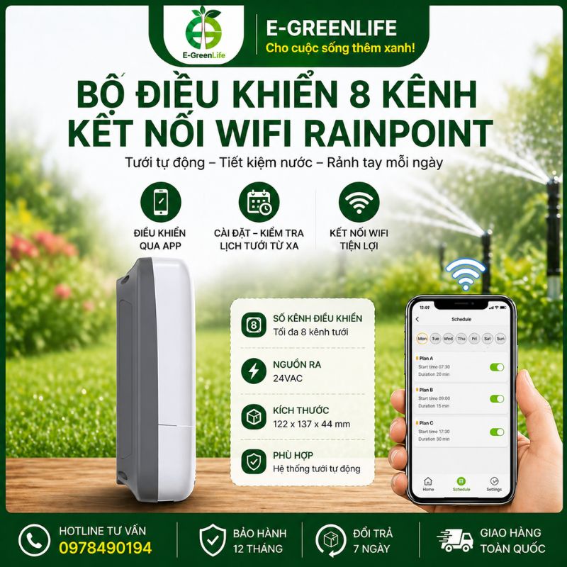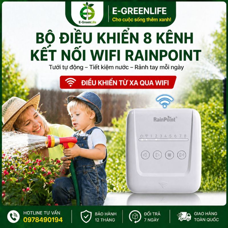 Bộ điều khiển 8 kênh kết nối wifi RainPoint giúp bà con tưới cây tự động, không cần có mặt tại vườn. Sản phẩm phù hợp khi muốn tiết kiệm thời gian, công sức và kiểm soát tưới chính xác. Bà con có thể dùng thiết bị như giải pháp tối ưu cho nhà vườn, sân vườn, trang trại cần vận hành ổn định và hiệu quả.