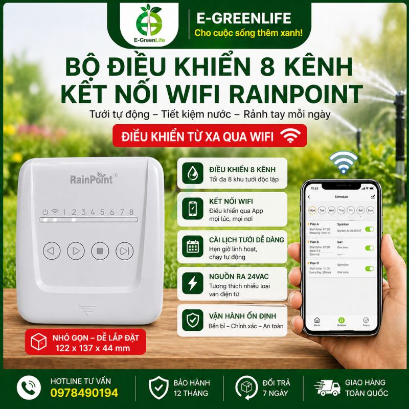 Mua Bộ điều khiển 8 kênh kết nối wifi RainPoint tại E-GreenLife, bà con yên tâm về chất lượng và hiệu quả sử dụng lâu dài. Bà con cần tư vấn, liên hệ ngay E-GreenLife qua hotline: 0978 490 194 để được hỗ trợ tận tình. Hoặc bà con có thể dễ dàng đặt mua sản phẩm này ngay trên website khi bấm vào: MUA NGAY cạnh hình ảnh. Hoặc bấm CHAT ĐỂ ĐƯỢC TƯ VẤN nhanh chóng. Xin cảm ơn!