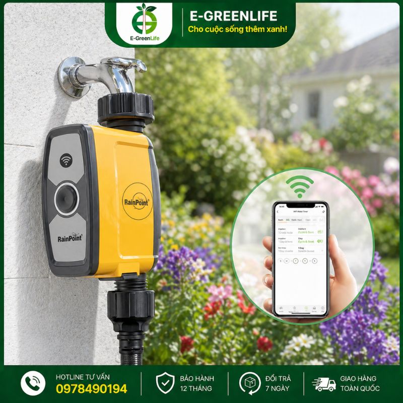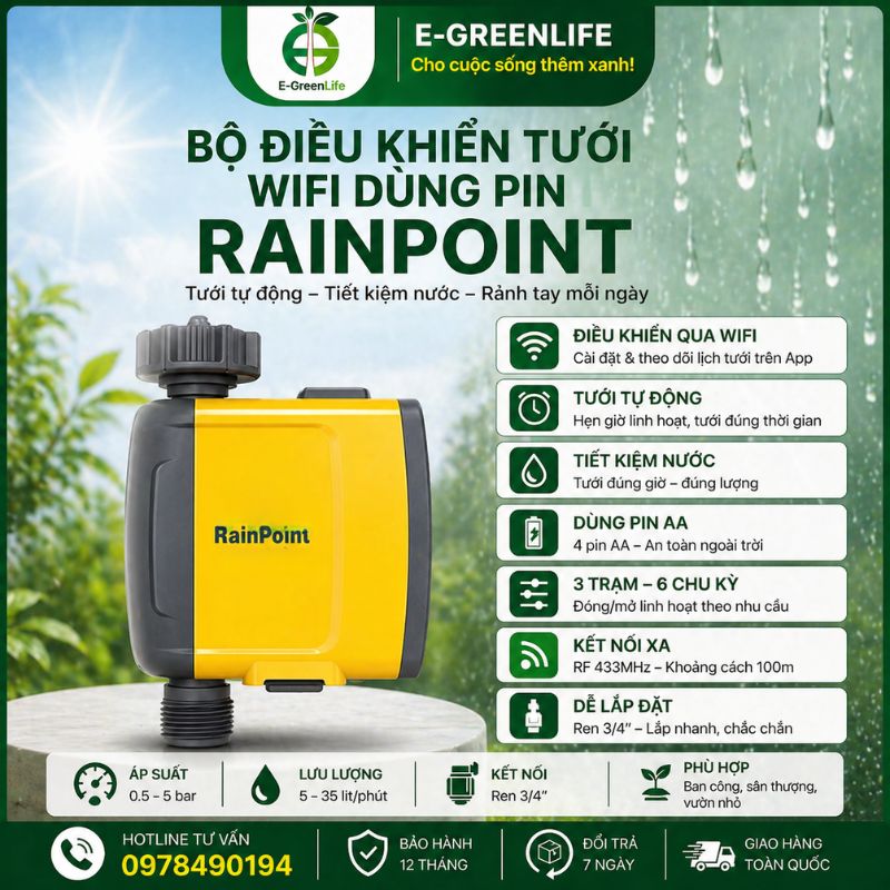 Bộ điều khiển tưới Wifi dùng pin RainPoint giúp bà con tưới cây tự động, không cần canh giờ mỗi ngày. Sản phẩm phù hợp khi đi vắng, bận rộn hoặc muốn chăm cây bài bản, tiết kiệm nước. Bạn chỉ cần điện thoại là kiểm soát lịch tưới mọi lúc, cây luôn đủ ẩm, phát triển tốt. Cùng xem giới thiệu chi tiết sản phẩm E-GreenLife phân phối ngay dưới đây!